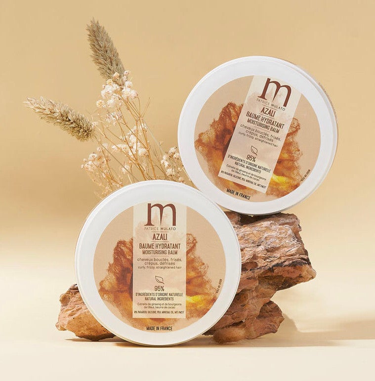 Le baume hydratant sans rinçage pour cheveux bouclés à frisés Azali de Patrice Mulato nourrit la fibre capillaire et l’enrobe d’un film protecteur lissant.