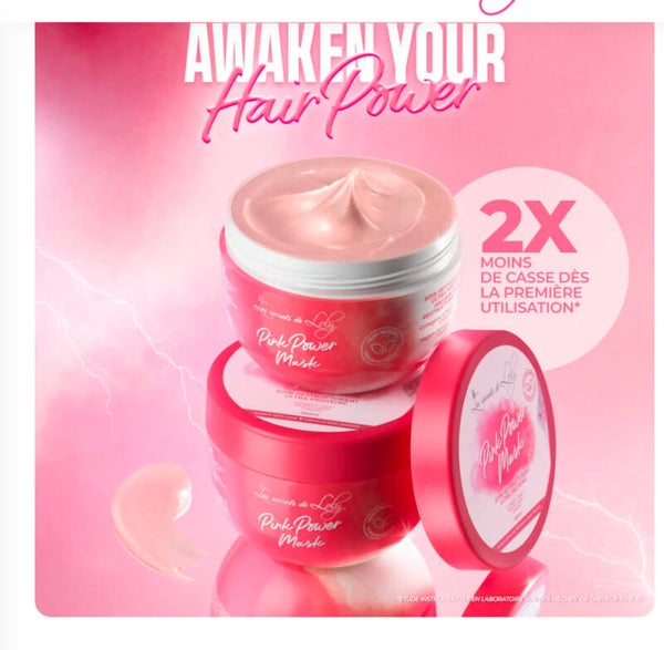 Conseils d'utilisation : Tous les 15 jours, prélevez une noisette de Pink Power Mask, faites chauffer la texture dans vos mains et appliquez-la section par section sur cheveux humides. Laissez poser 5 à 10 minutes et rincez à l'eau tiède.